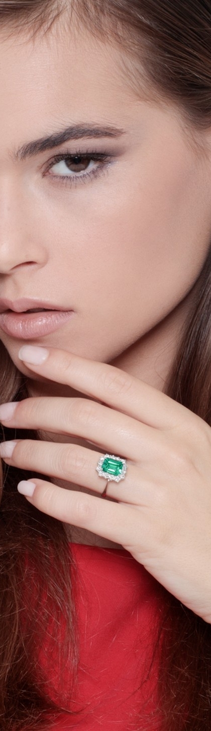White gold 18k halo ring with diamonds and emerald