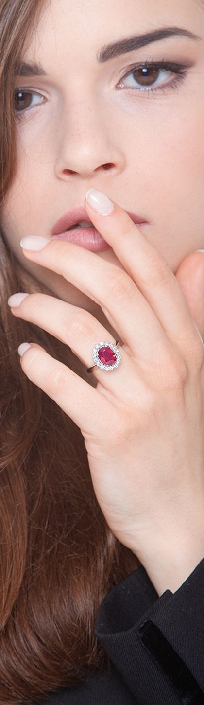 Anello contorno in oro bianco 18k con Rubino centrale e Diamanti