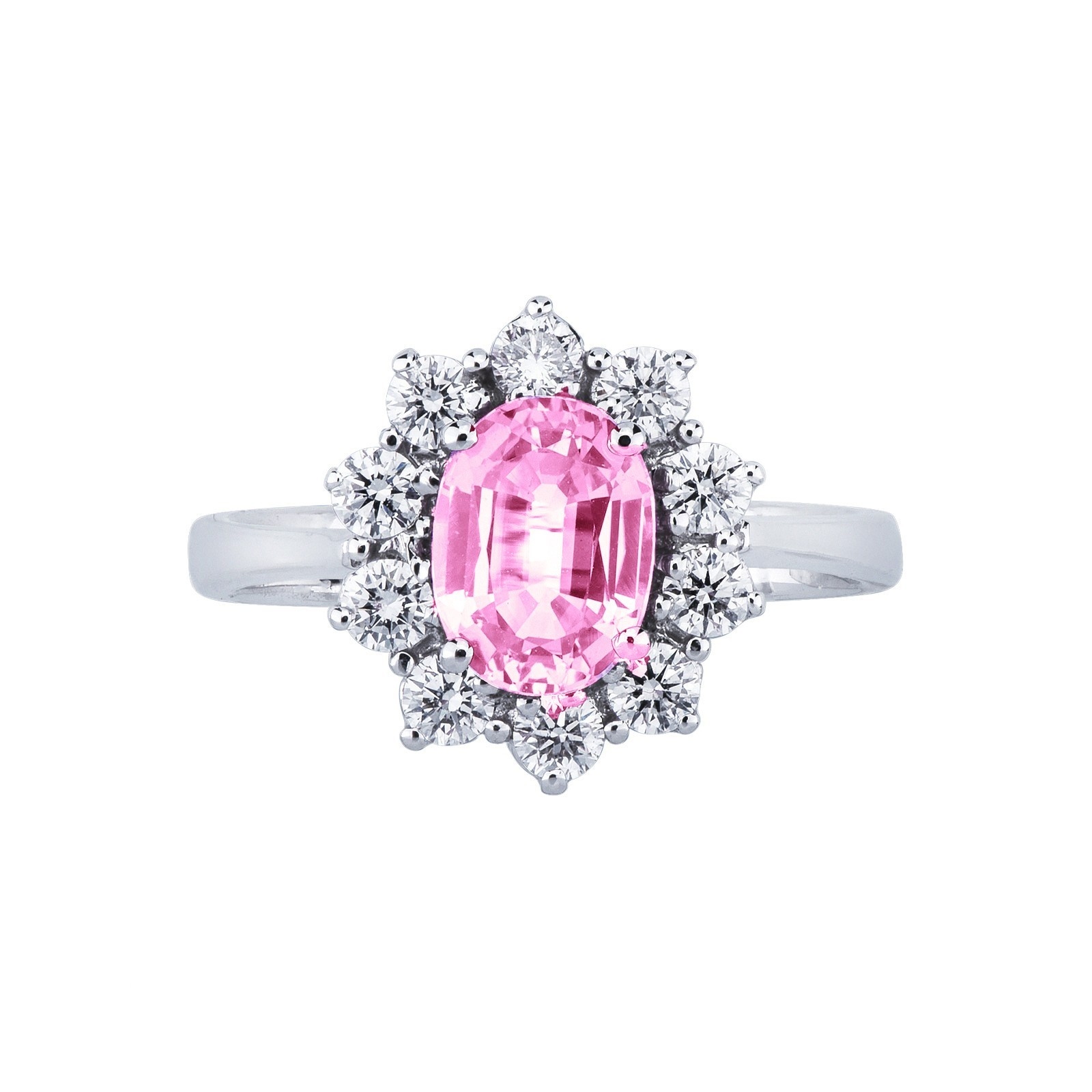 Anello contorno in oro bianco 18k con zaffiro rosa di circa 8x6 mm e diamanti taglio brillante.
