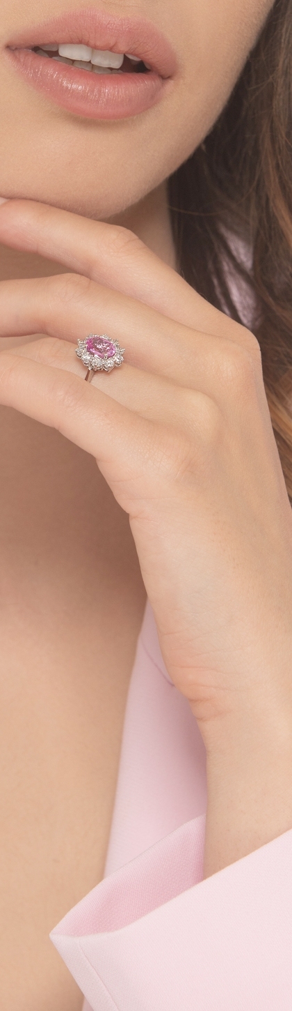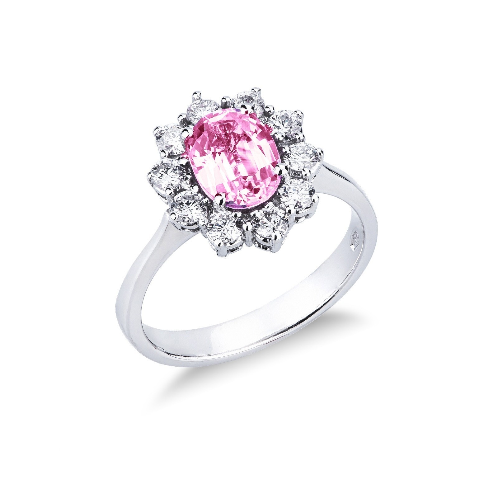 Anello contorno in oro bianco 18k con zaffiro rosa ovale e diamanti a contorno