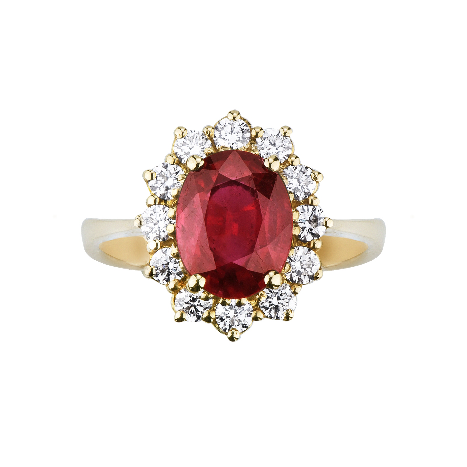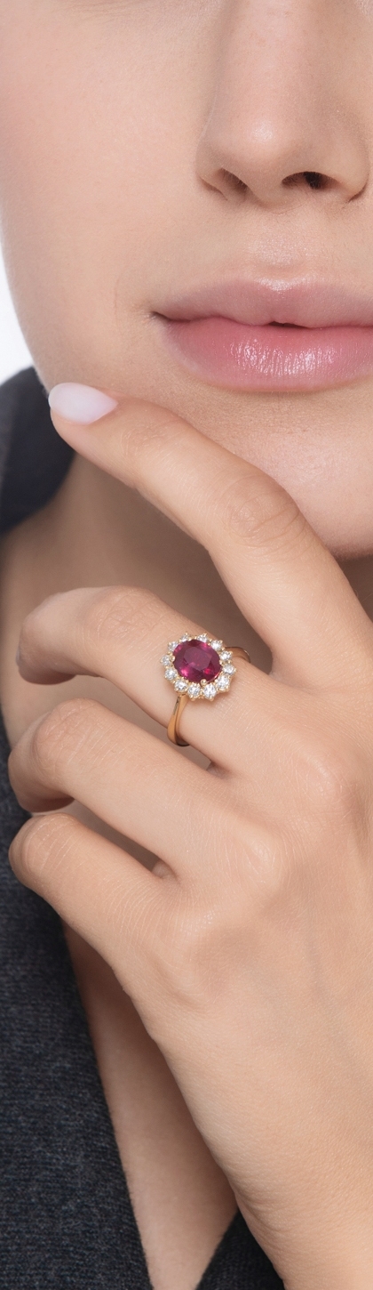 Anello rosetta in oro giallo 18k con rubino ovale e diamanti taglio brillante, colore G, purezza Vs. Il rubino misura circa 9x7 mm.
