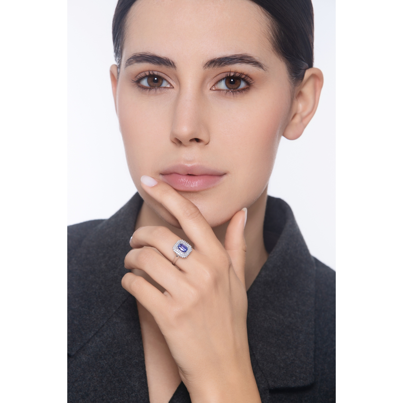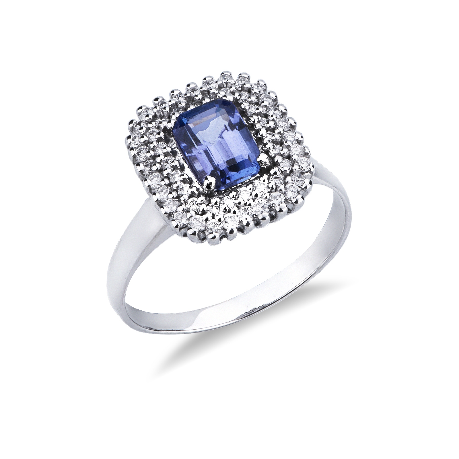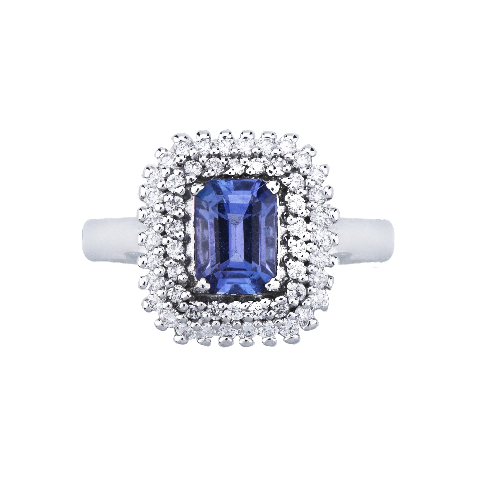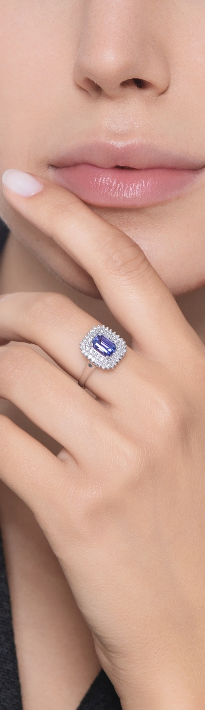 Anello doppio contorno in oro bianco 18k con tanzanite e diamanti
