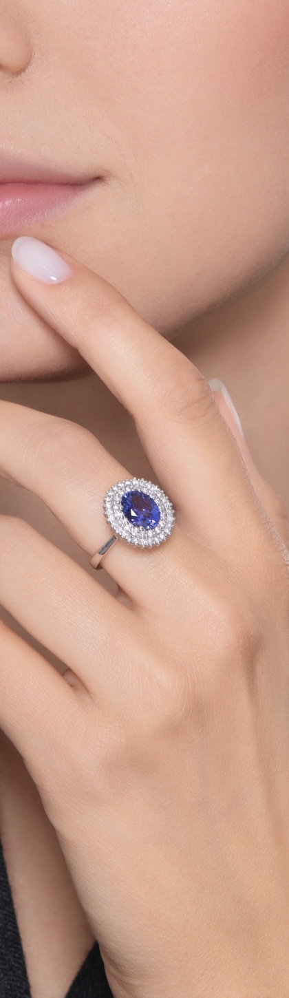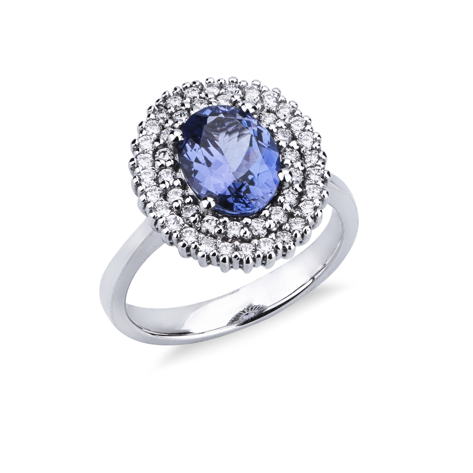 Anello doppio contorno in oro bianco 18k e tanzanite ovale