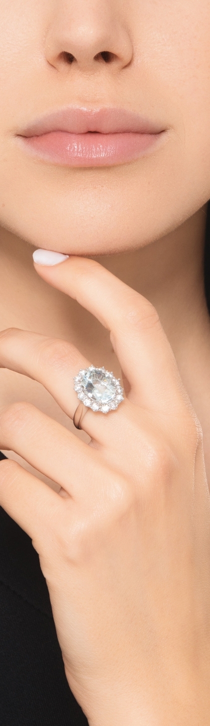 Anello halo con acquamarina ovale e diamanti in oro bianco 750