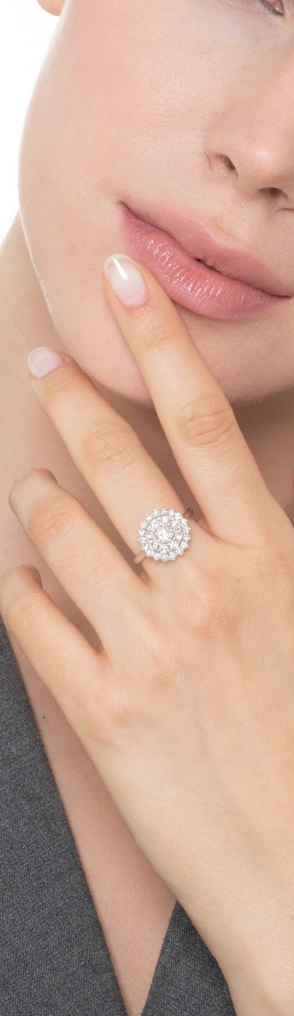Anello in oro bianco 18k a doppio contorno di diamanti.