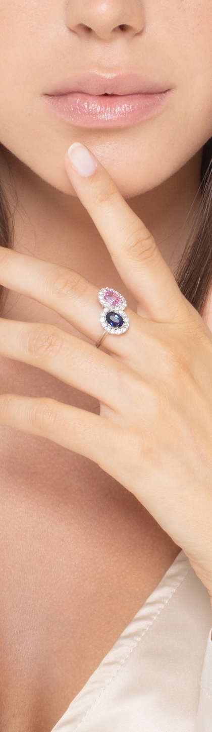 Anello in oro bianco 18k con 2 contorni di zaffiro rosa e blu e diamanti