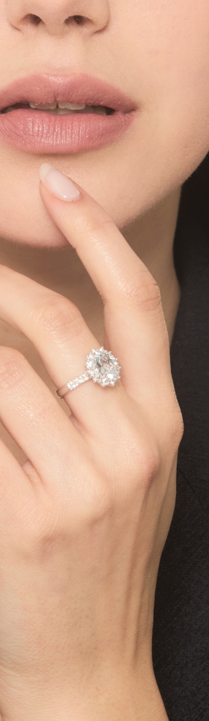 Anello in oro bianco 18k con acquamarina ovale e contorno in diamanti