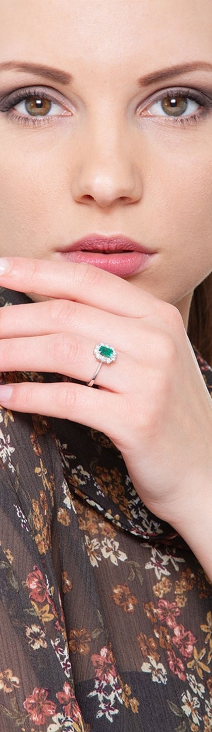 Anello in Oro Bianco 18k con Diamanti a contorno e Smeraldo centrale.