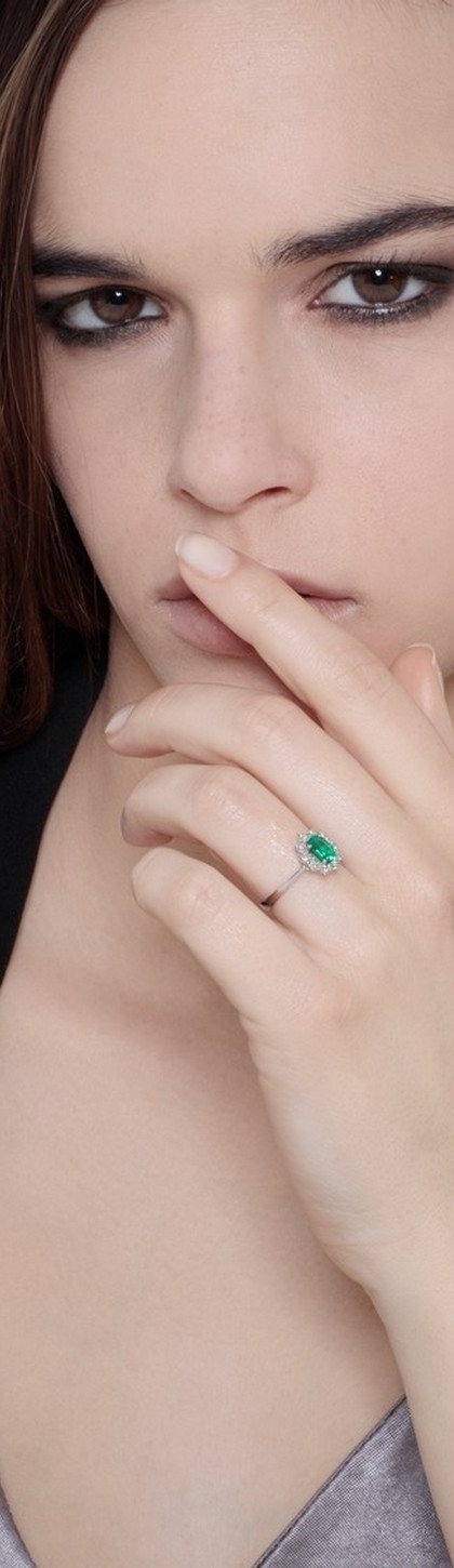 Anello in oro bianco 18k con diamanti a contorno e Smeraldo