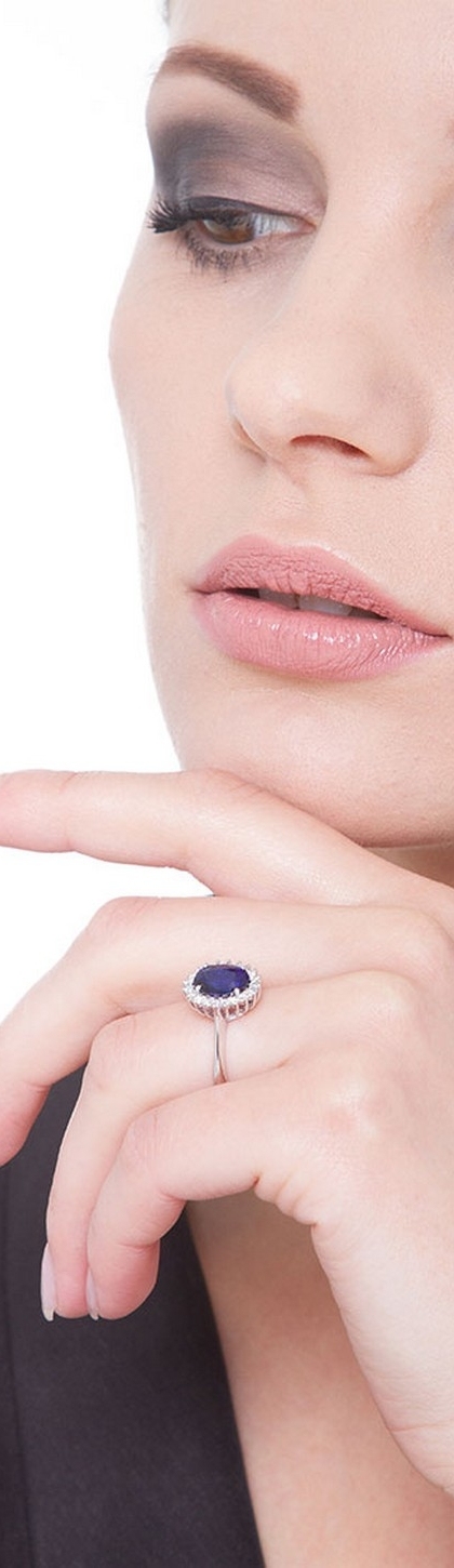 Anello in oro bianco 18k con diamanti a contorno e Zaffiro blu ovale