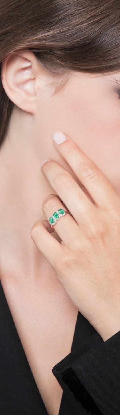 Anello in oro bianco 18k con diamanti e smeraldi ovali