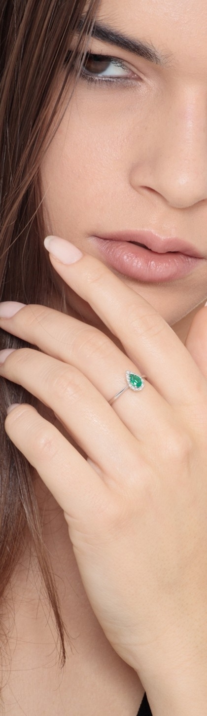 Anello in oro bianco 18k con diamanti e smeraldo a goccia.