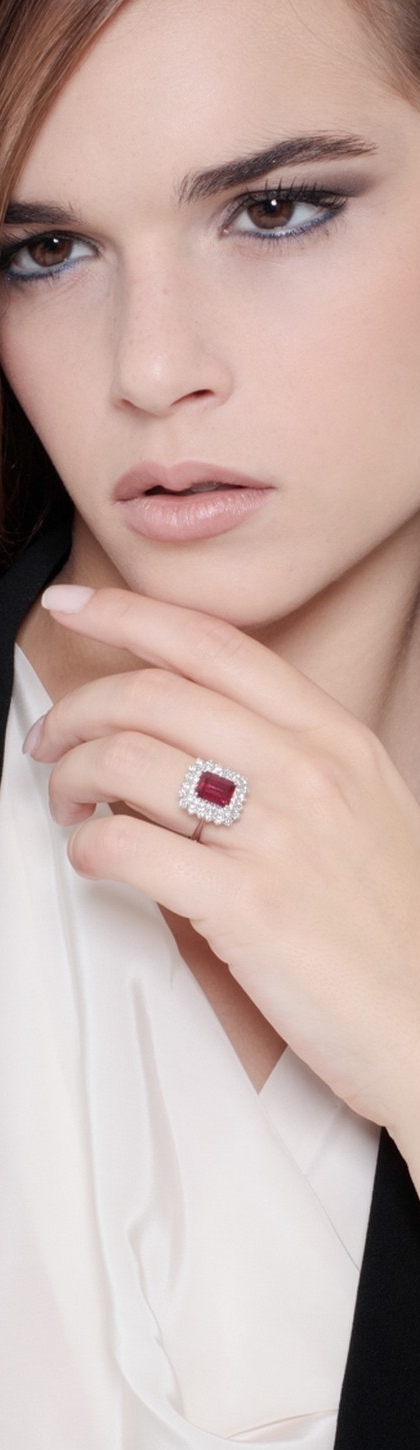 Anello in oro bianco 18k con doppio contorno in Diamanti e Rubino rettangolare.