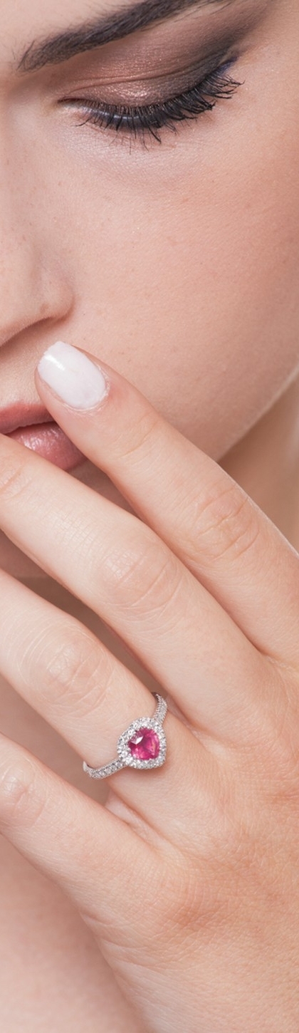 Anello in oro bianco 18k con Rubino a cuore e diamanti a contorno e sul gambo.