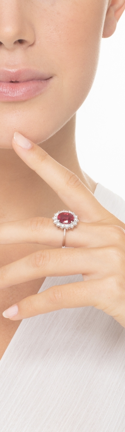 Anello in oro bianco 18k con rubino ovale di circa 11x9 mm e contorno in diamanti