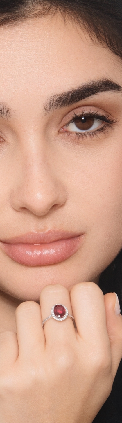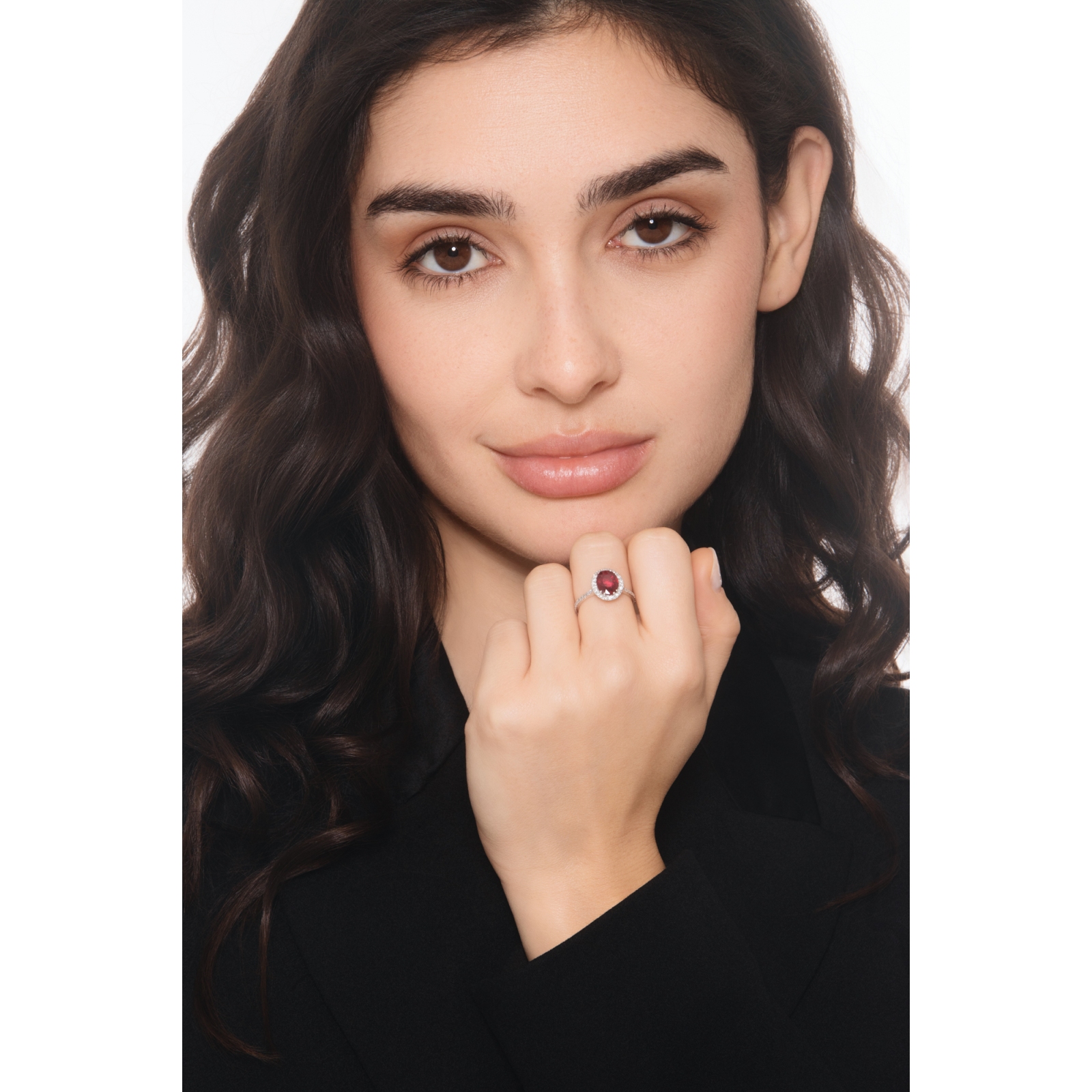Anello in oro bianco 18k con rubino ovale e diamanti a contorno e sul gambo