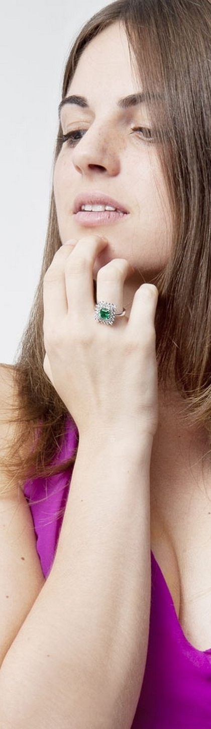 Anello in oro bianco 18k con Smeraldi e doppio contorno in Diamanti.