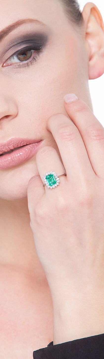Anello in oro bianco 18k con smeraldo e diamanti a contorno