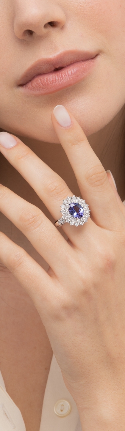 Anello in oro bianco 18k con tanzanite ovale centrale e doppio contorno in diamanti