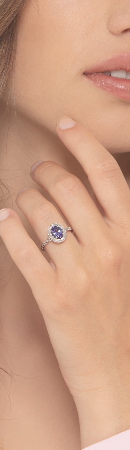 Anello in oro bianco 18k con tanzanite ovale e diamanti a contorno