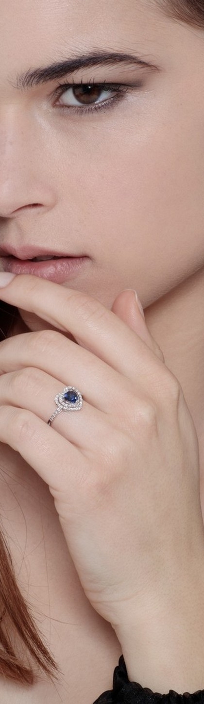 Anello in oro bianco 18k con Zaffiro Blu a cuore al centro e diamanti a contorno
