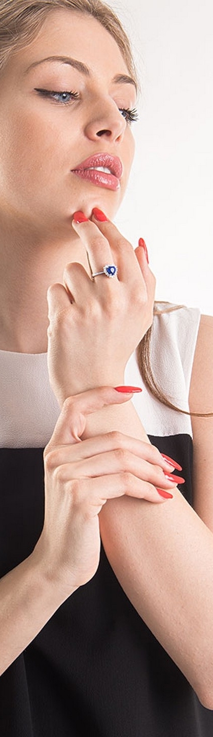 Anello in oro bianco 18k con zaffiro blu a cuore e contorno in diamanti
