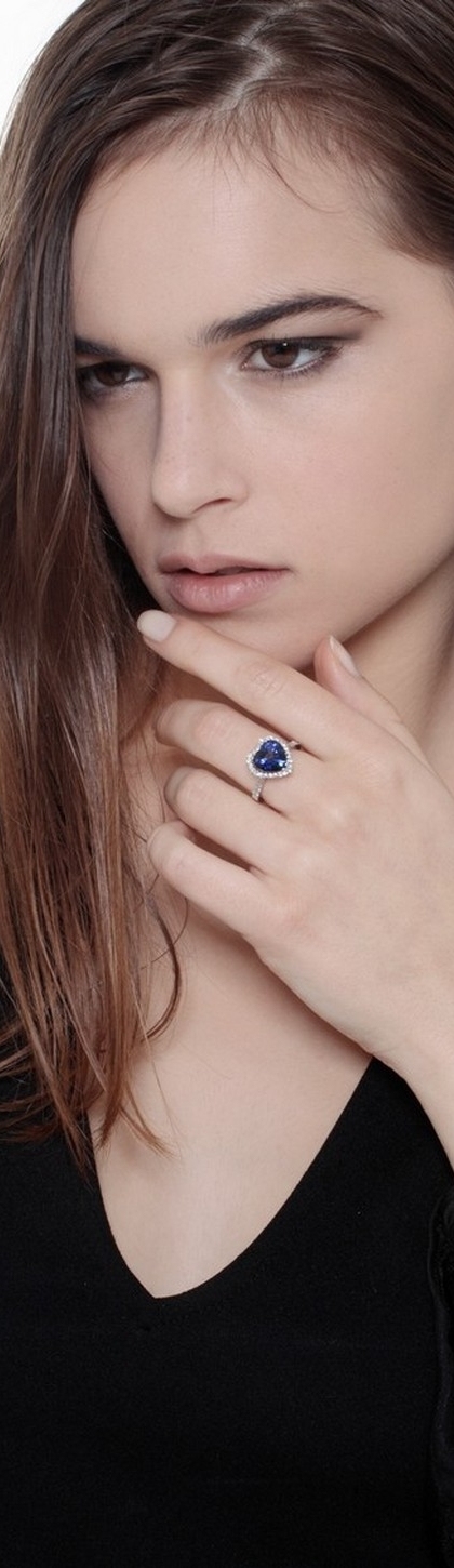 Anello in oro bianco 18k con Zaffiro Blu a cuore e diamanti a contorno e nel gambo