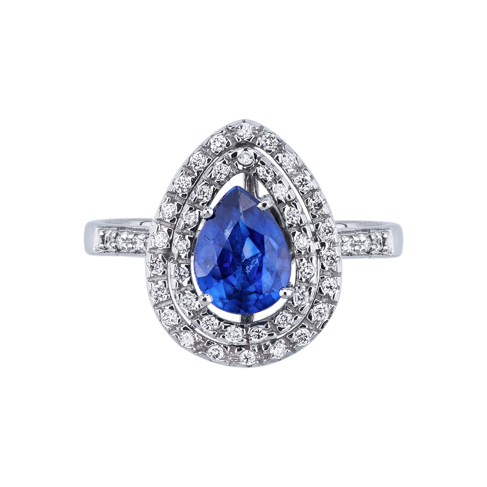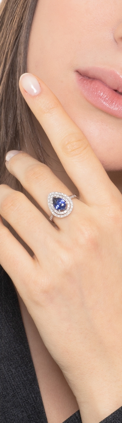 Anello in oro bianco 18k con zaffiro blu a goccia e diamanti anche sul gambo