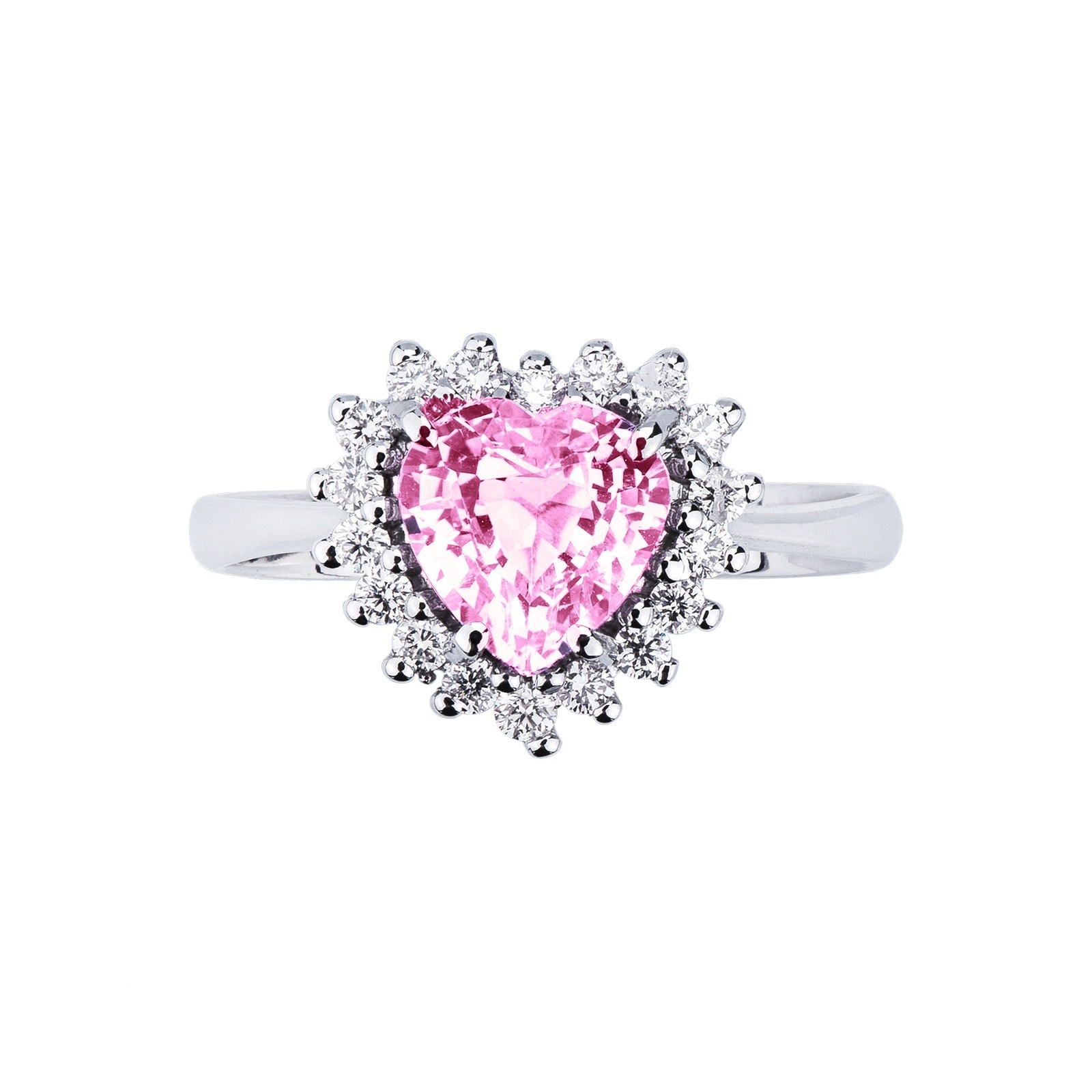 Anello contorno o a rosetta con zaffiro rosa a forma di cuore centrale contornato da diamanti taglio brillante, colore G, purezza VS.