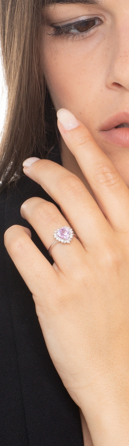 Anello in oro bianco 18k con zaffiro rosa a cuore e diamanti