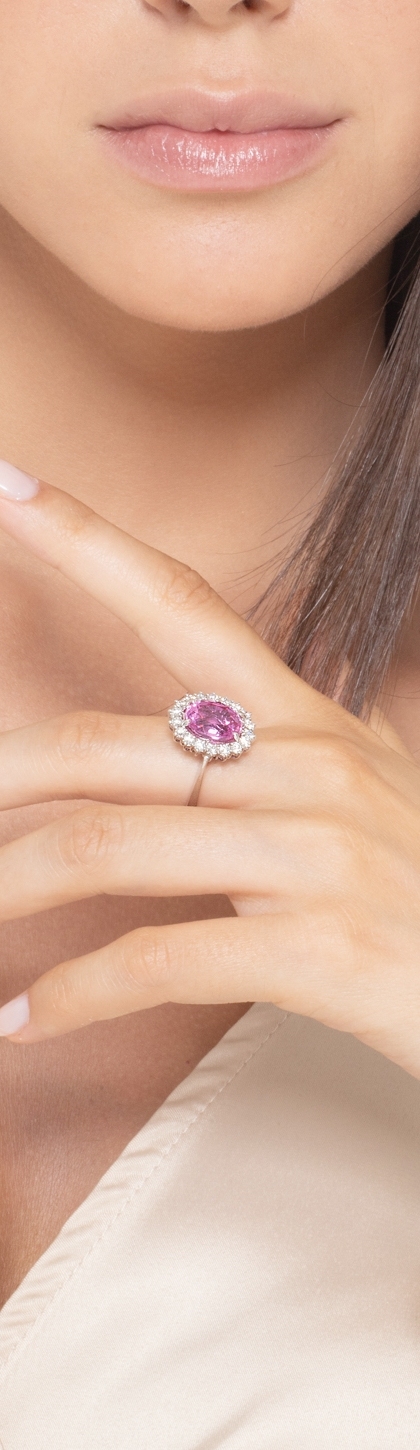 Anello in oro bianco 18k con zaffiro rosa centrale e contorno in diamanti