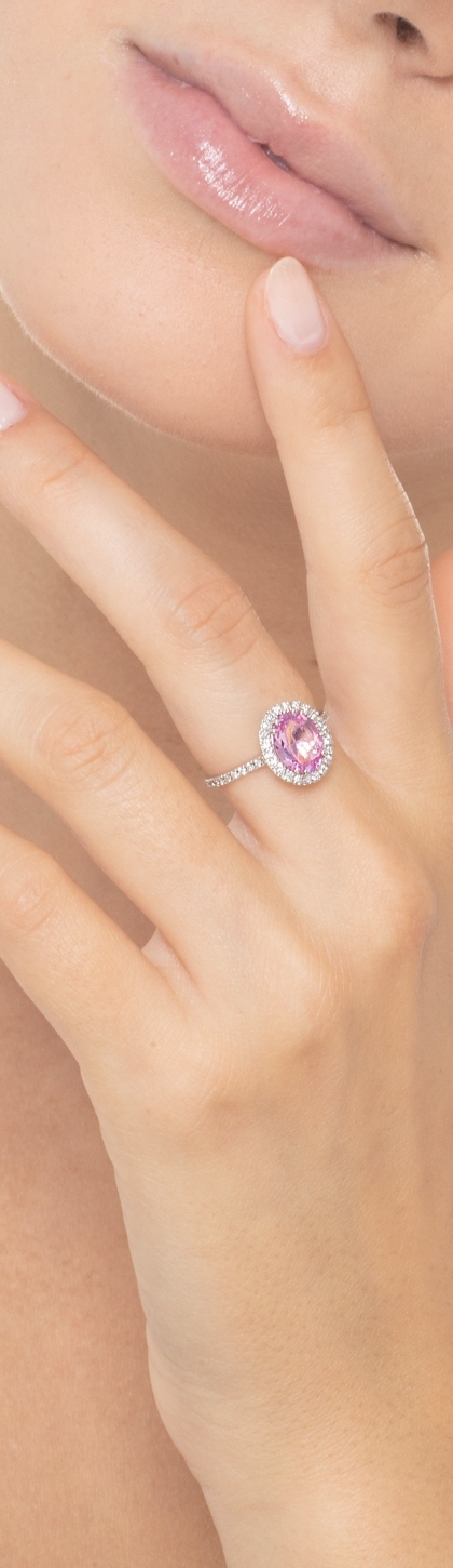 Anello in oro bianco 18k con zaffiro rosa ovale e diamanti a contorno e sul gambo