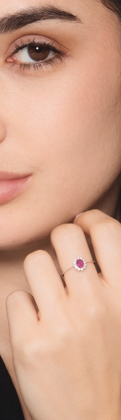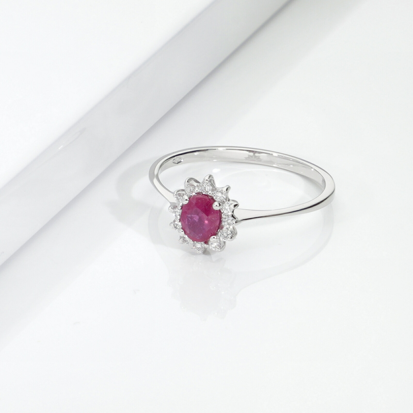 Anello in oro bianco 18k con rubino ovale e contorno in diamanti taglio brillante, colore G, purezza Vs. Il rubino misura circa 5x4 mm