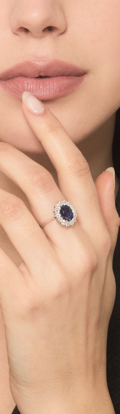 Anello in oro bianco 750 con zaffiro blu ovale e diamanti