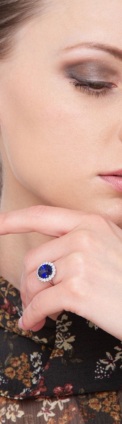 Anello modello contorno in oro bianco 18k con Zaffiro Blu centrale e diamanti