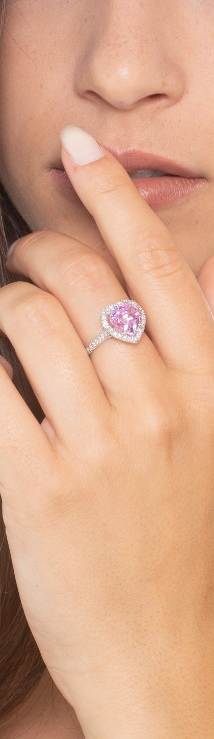 Anello in oro bianco 18k con Zaffiro rosa a Cuore di circa 10x10 mm e diamanti taglio brillante colore G e purezza Vs.