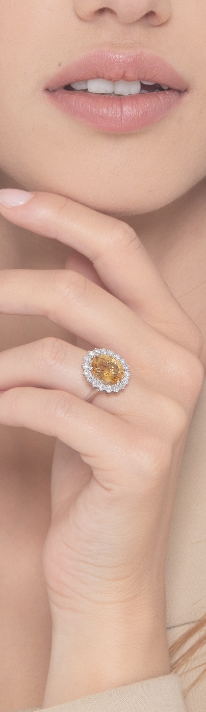 Anello rosetta con Citrino e contorno con Diamanti in oro bianco 18k