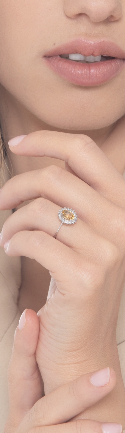 Anello contorno o a rosetta con citrino centrale contornato da diamanti taglio brillante, colore G, purezza Vs. L'oro bianco 18k, grazie al suo colore neutro, fa si che i diamanti e il citrino diventino protagonisti.