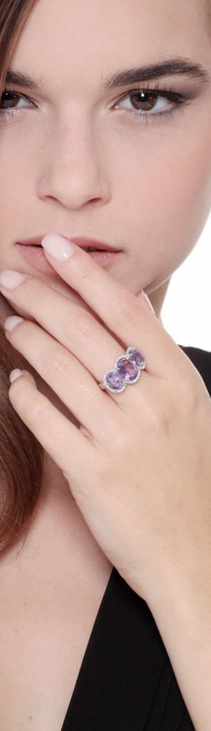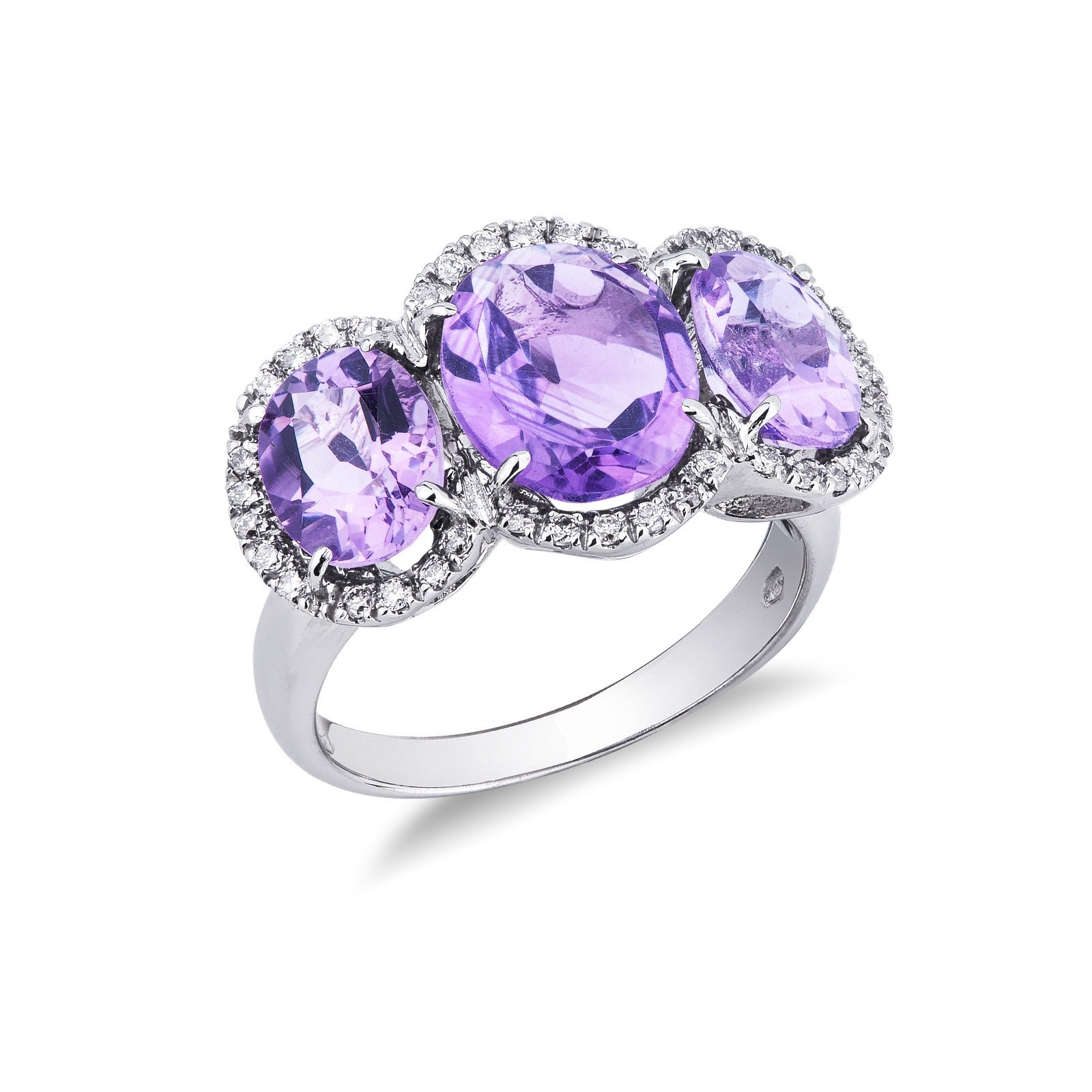 Anello tipo trilogy in Oro Bianco 18k con Ametiste e Diamanti