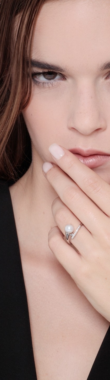 Anello contrariè in oro bianco 18k con Perla e Diamanti.