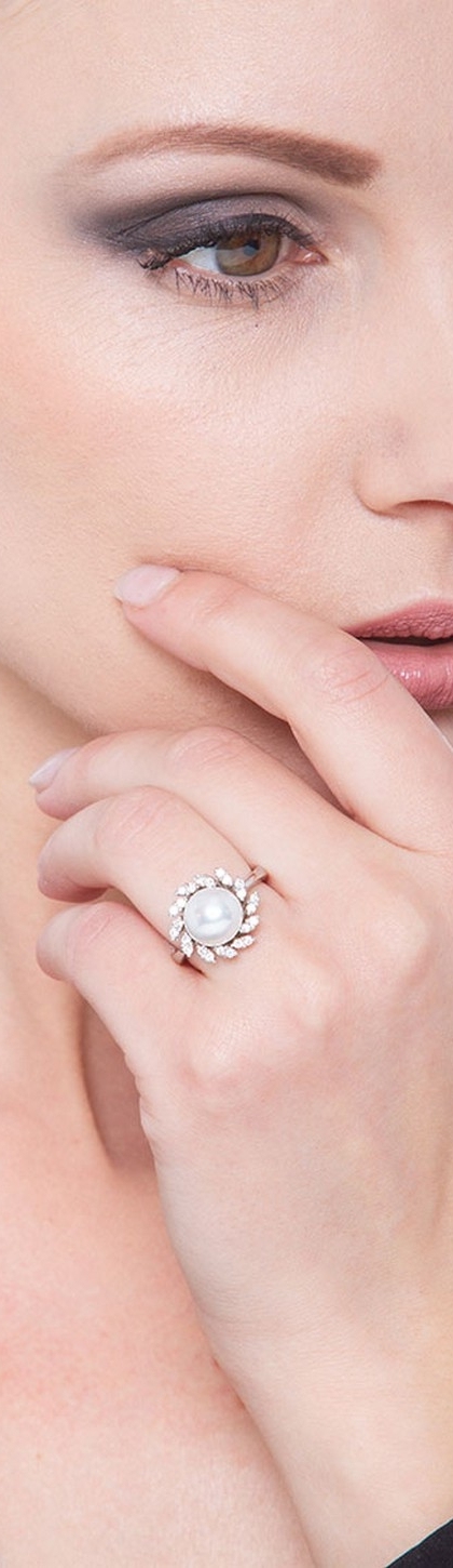 Anello in oro bianco 18k con Perla e contorno a raggiera in diamanti.