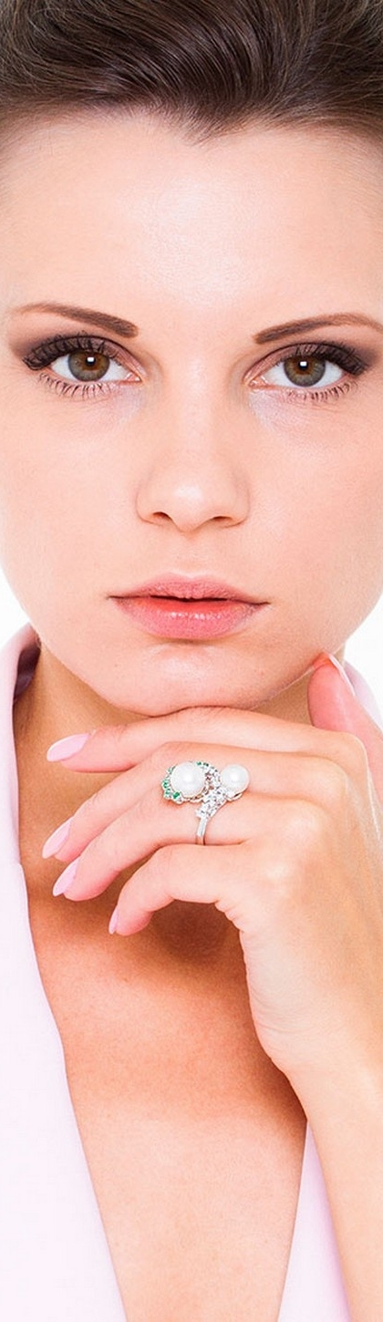 Anello in oro bianco 18k con Perle, smeraldi e diamanti.