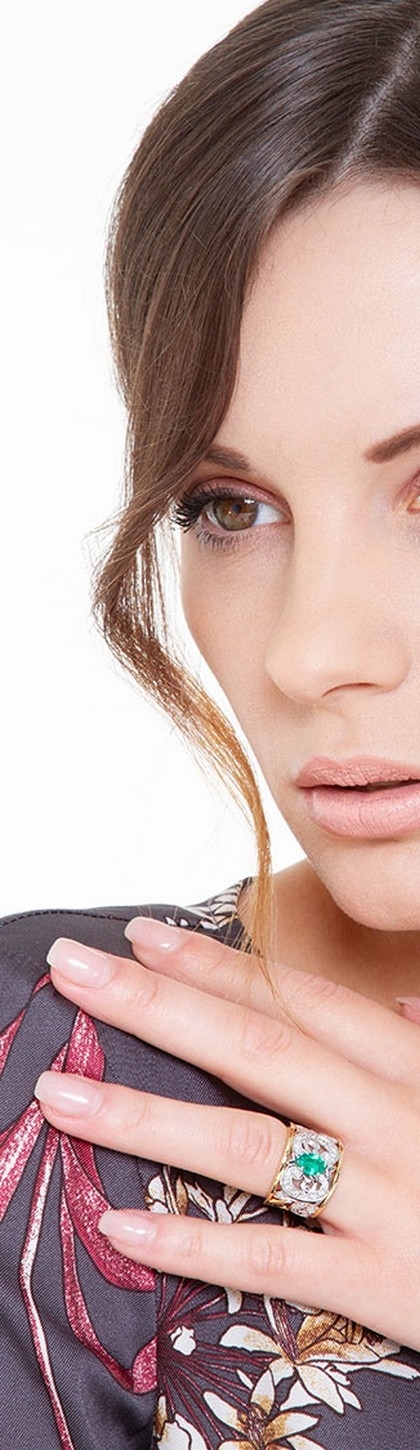 Anello a fascia in oro bianco e giallo 18k con smeraldo e diamanti