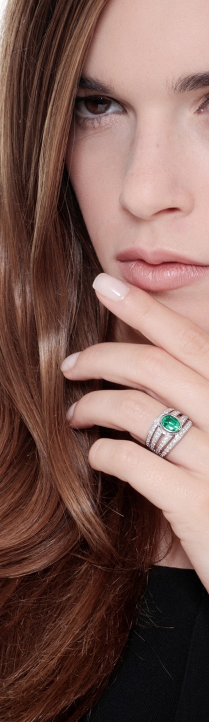 Anello Fascia 4 file in Oro bianco 18k con Smeraldo e Diamanti