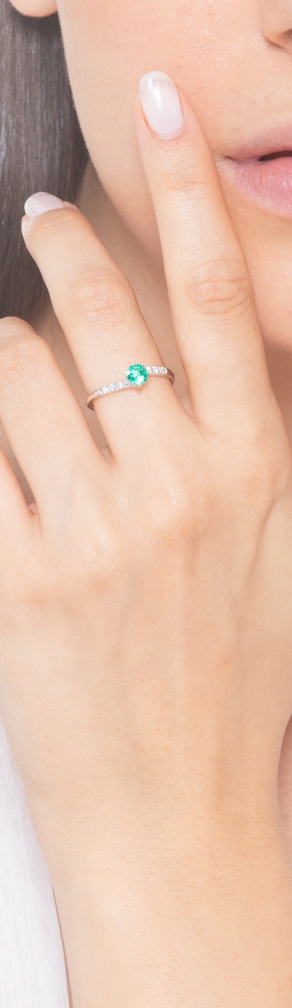 Anello fedina in Oro Bianco 18k con Diamanti e Smeraldo al centro