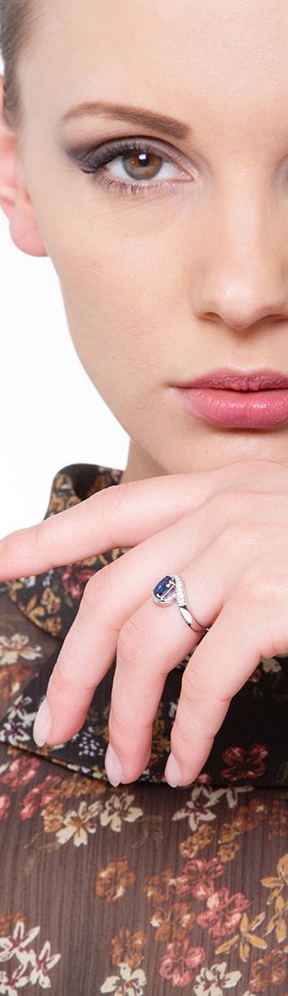 Anello in oro bianco 18k con al centro Zaffiro blu ovale e diamanti