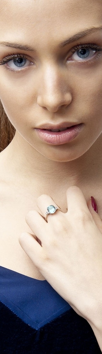 Anello in oro bianco 18k con diamanti e acquamarina centrale