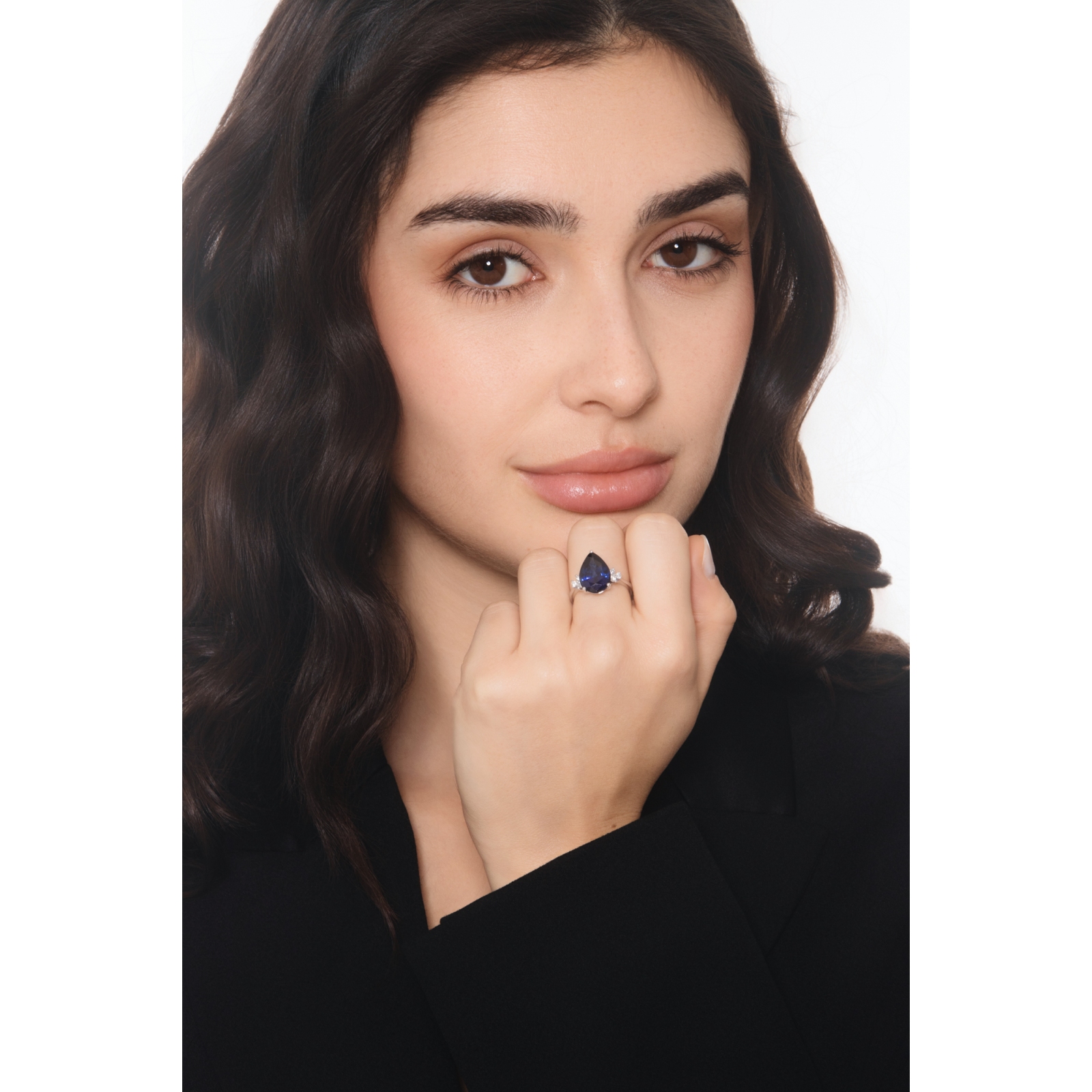Anello in oro bianco 18k con grande zaffiro blu a goccia e 3 diamanti per lato