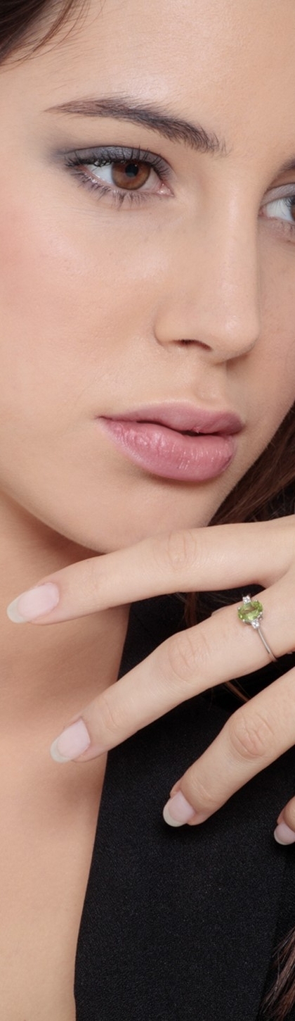 Anello in oro bianco 18k, con peridoto taglio ovale ed ai lati diamanti taglio brillante colore G e purezza Vs.