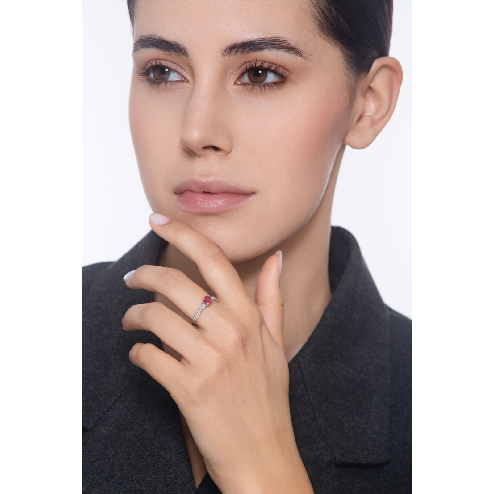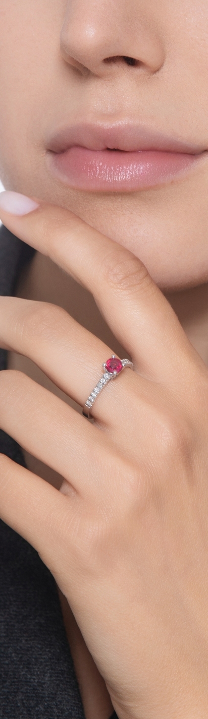 Anello in oro bianco 18k con Rubino centrale e diamanti sul gambo